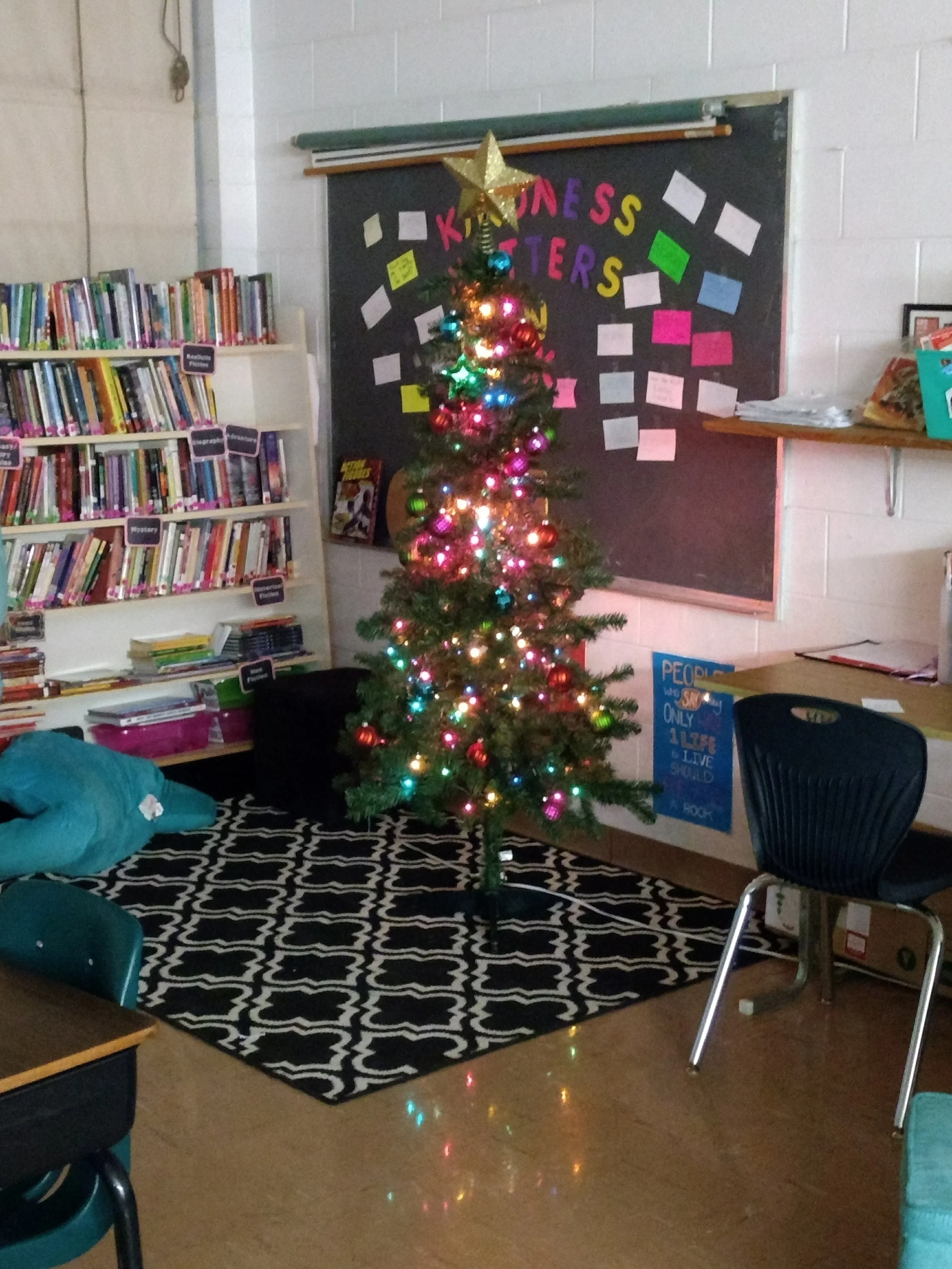 The ornaments, lights, and tree topper were hand-me-downs from a colleague’s mother, but I think they work just great. I loved having it near the reading corner and as you can see that carpet is just waiting for students to circle round and celebrate a “Classroom Christmas Morning”.